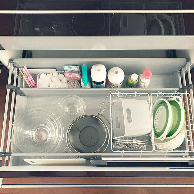 わが家の以前のキッチンシンク下の引き出しです。 ボウル3つ、ざる1つを収納しているます。 一見すっきり使いやすいようにも見えるのですが気になっていた事が2点。 収納スペースを有効活用できていない。トトノで揃えてトトノう収納。キッチン収納ケース ザル・ボウルスタンド コンパクト システムキッチン 引き出し用 トトノ ( ザルスタンド 収納スタンド キッチン収納 シンク下 引出し用 キッチンツール 収納 整理ケース 整理 仕切り付き totono )キッチンの引き出しの中を簡単にスッキリさせたい人必見! これでスッキリ取りやすい!フライパン・鍋収納アイデア3選 生活に欠かせない洗剤・消耗品収納アイデア3選 5 生活感がないほどキレイなのは「詰め替えアイテム」のおかげ